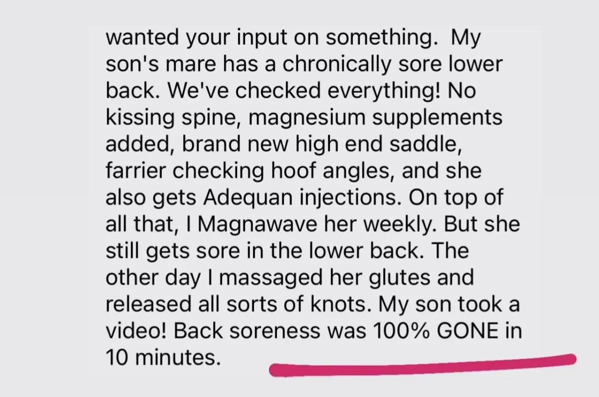 The goal is simple: better outcomes for horses. Our methods are practical, effective, and driven by real relief and results.