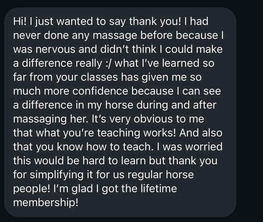 Seamlessly access hours of educational videos to learn from and use at home! You can learn with me in my member portal for just $29/month. All students who have taken a certification with me, or at Equissage California will receive a lifetime membership.